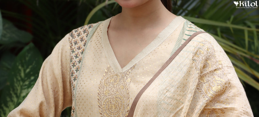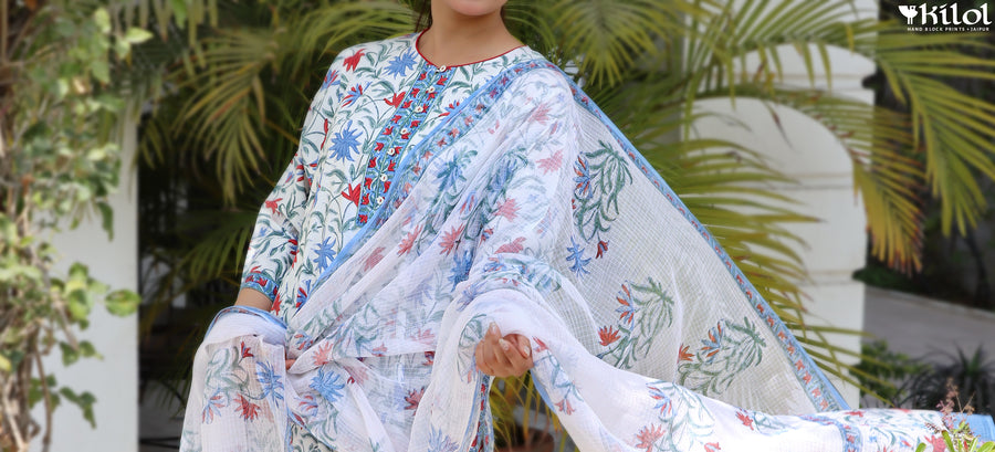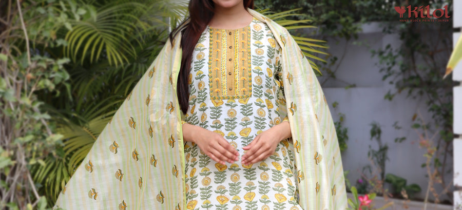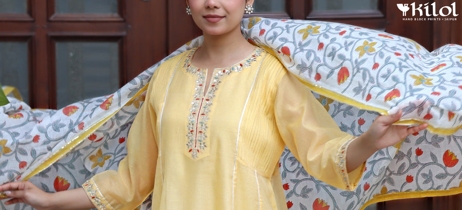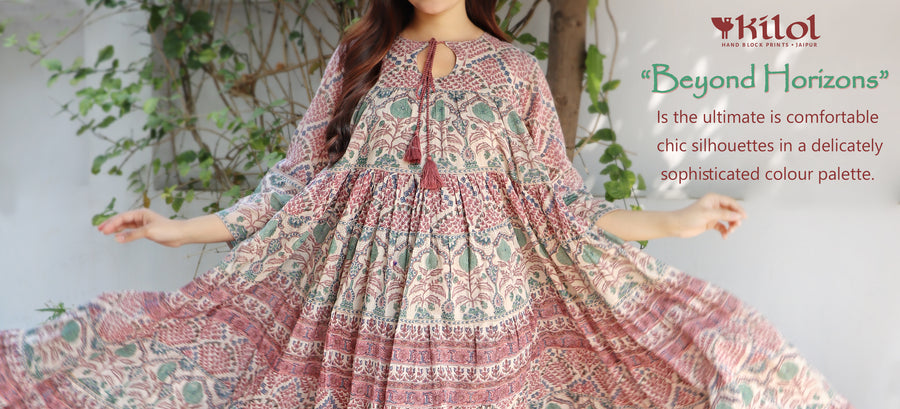 At Kilol, we have a wide range of products in the apparel category- ranging from ethnic wear like Kurta, Dupattas and Sarees to modern wear like Kaftans, Tunics, Dresses and Pants all designed and tailored in house by our team of fabricators.
